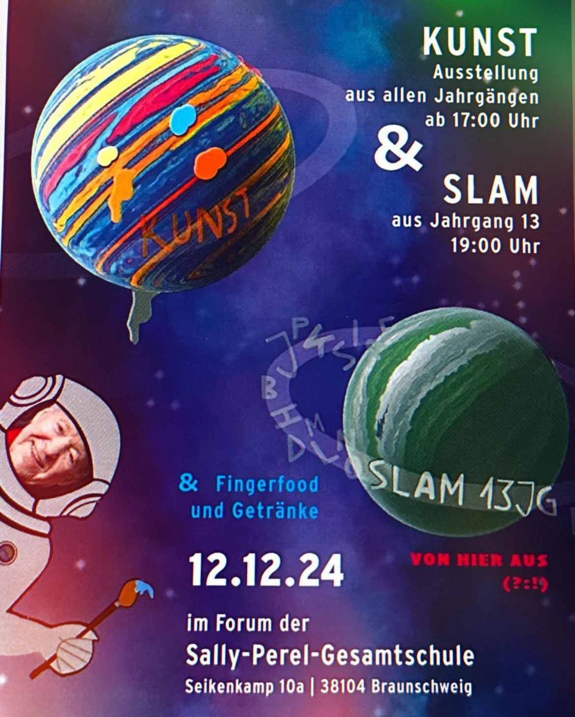 Am 12.12. um 19:00 Uhr findet unser Slam Abend im Forum der Sally-Perel-Gesamtschule statt! Davor gibt es ab 17:00 Uhr Kunstausstellungen aus verschiedenen Jahrgängen und natürlich ist auch für Verpflegung gesorgt ;)
