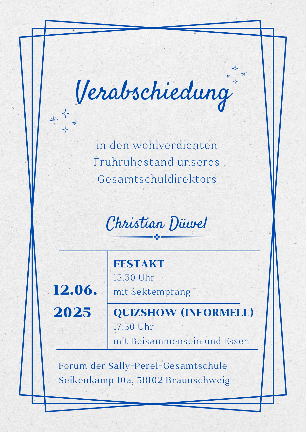 Am 12. Juni möchten wir unseren Gesamtschuldirektor Christian Düwel in den wohlverdienten Frühruhestand schicken. Dazu haben wir einige Aktionen geplant (u.a.):