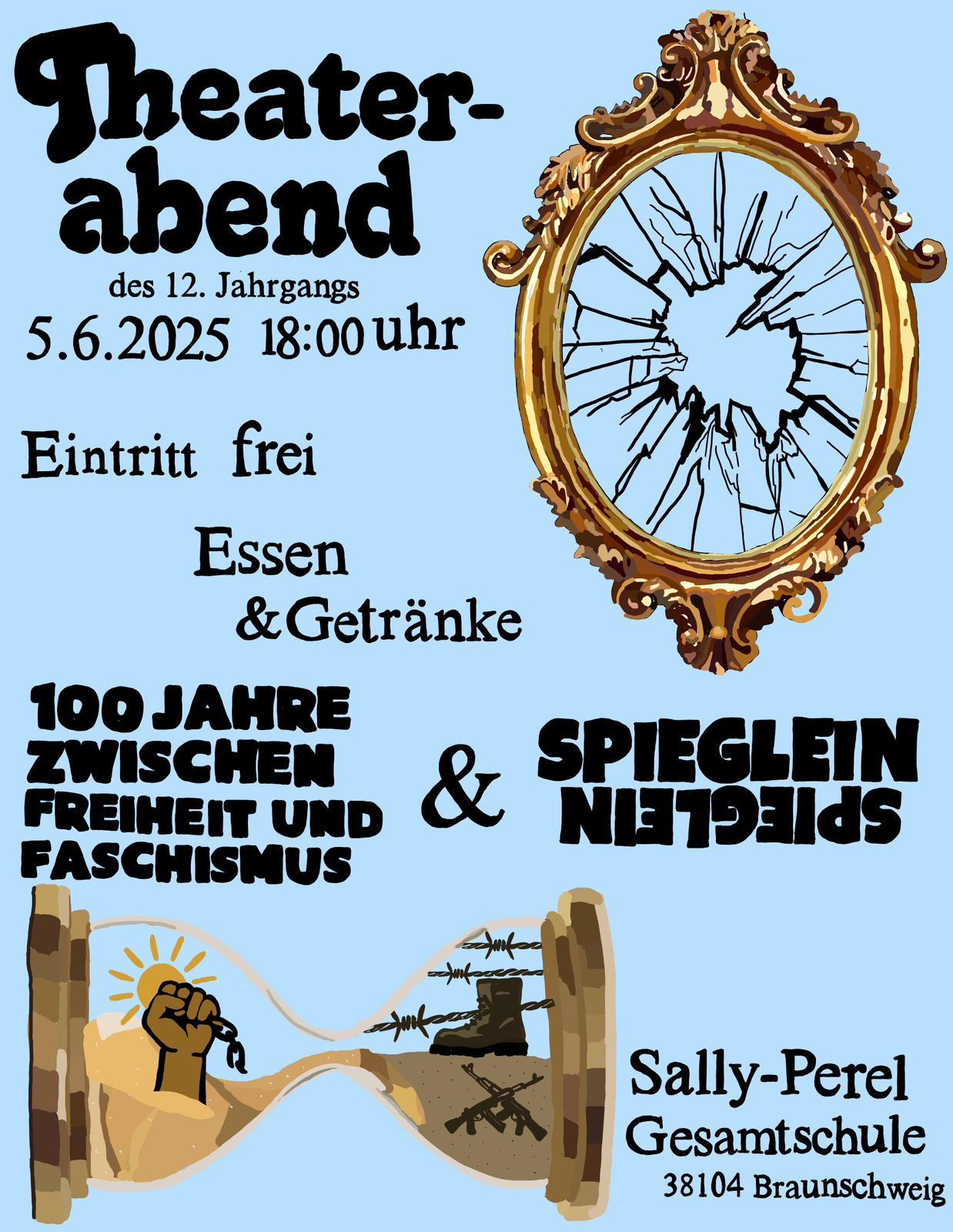 Am 05. Juni 2025 findet der Theaterabend des 12. Jahrgangs statt. Es werden die beiden Stücke "100 Jahre zwischen Freiheit und Faschismus", sowie "Spieglein Spieglein" vorgeführt. Der Eintritt ist frei, über eine Spende wird sich trotzdem gefreut. Zusätzlich ist selbstverständich auch für das kulinarische Wohl (Essen und Getränke) gesorgt.